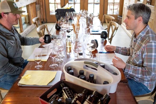 Andrew Delos takes making wine seriously (he's the serious-looking winemaker on the right, pictured). But when National Cheese Ball Day happens to coincide with our April Hosted at Home virtual happy hour, he’s happy to let his lighter side show.