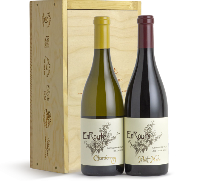Exceptional texture and flavor come together in this one-of-a-kind boxed duet. Discover the subtle fruit flavors and fresh minerality of one of our favorite Russian River Valley Chardonnays alongside the ripe berry and sleek texture of our flagship Russian River Pinot Noir, the EnRoute Les Pommiers.